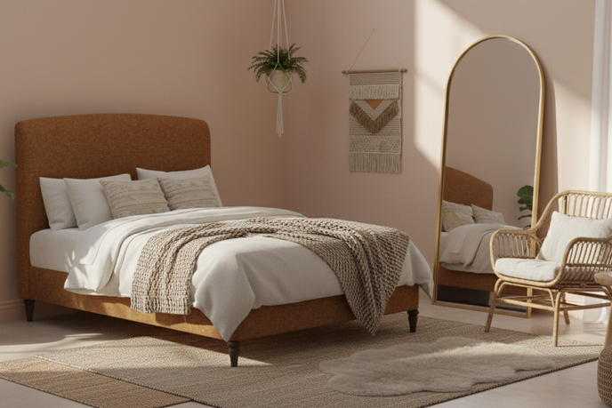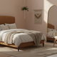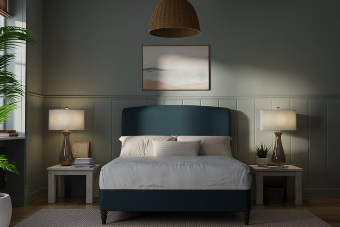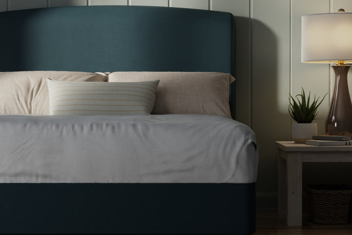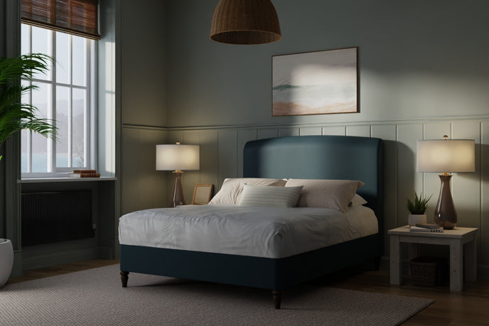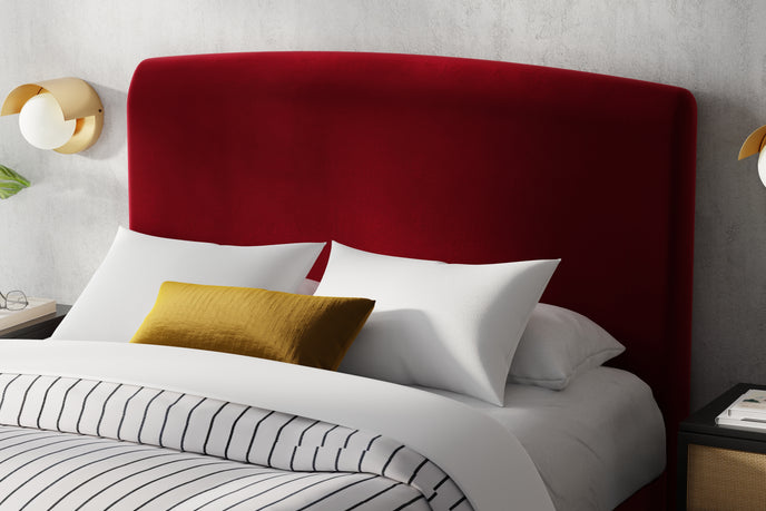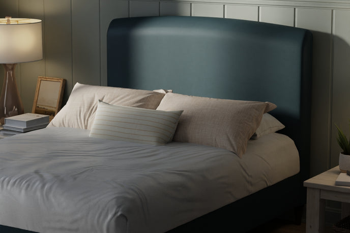 The gently arched headboard draws inspiration from classic forms—reimagined through a modern lens. Its sculptural profile creates a natural focal point, while the generously padded upholstery offers a cocooning backdrop for slow mornings and unhurried evenings. There is a sense of protection and permanence here—something solid to lean into at the end of the day.