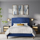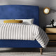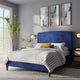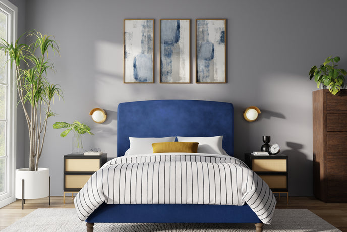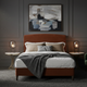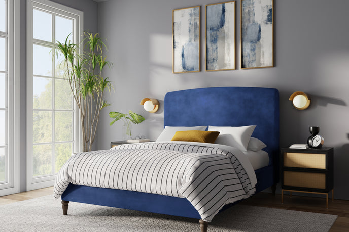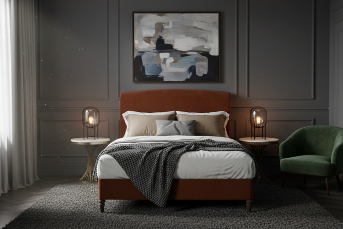 Wrapped in a velvety, matte fabric with depth and warmth, the finish absorbs light beautifully, adding richness without excess. The low, grounded base enhances the feeling of stability and serenity, allowing the bed to sit confidently within the space rather than dominate it.
